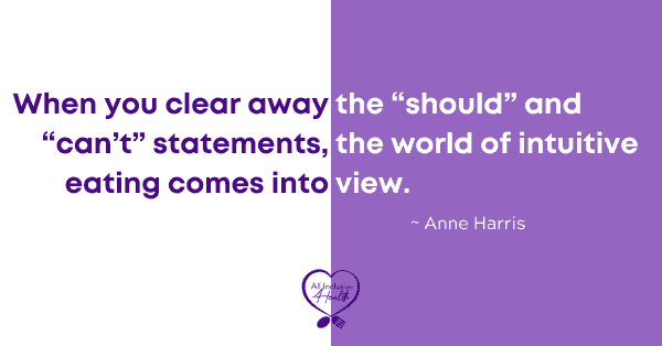 If you had been well-nourished all along, you might have chosen salmon with rice and a garden salad or steak with roasted potatoes and grilled veggies. Be thoughtful, though, and ask yourself if you believe eating “good” food makes you good and choosing “bad” food makes you bad. Simply put, that’s a non-starter. When you clear away the “should” and “can’t” statements, the world of intuitive eating comes into view.